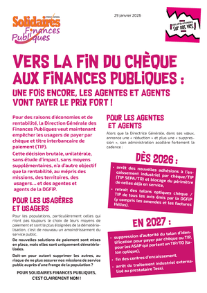 Pour des raisons d’économies et de rentabilité, la Direction Générale des Finances Publiques veut maintenant empêcher les usagers de payer par chèque et titre interbancaire de paiement (TIP). Cette décision brutale, unilatérale, sans étude d’impact, sans moyens supplémentaires, n’a d’autre objectif que la rentabilité, au mépris des missions, des territoires, des usagers… et des agentes et agents de la DGFiP.